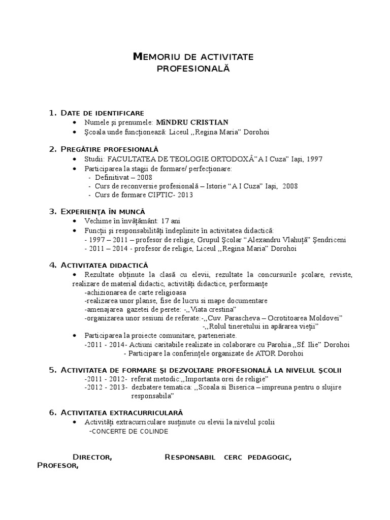 în teologie ortodoxă ucenic al preotului prof univ dr. Fil10 memoriu activitate 09 noiembrie 2014. Profesorii de religie clerici preoți sau diaconi vor completa raportul de activitate al clericilor implicați în predarea religiei în anul școlar 2020 2021 avizat de părintele protoiereu de la protoieria de care aparțin și de preotul paroh în cazul diaconilor și al preoților coslujitori. Comentarii 5 0 0.