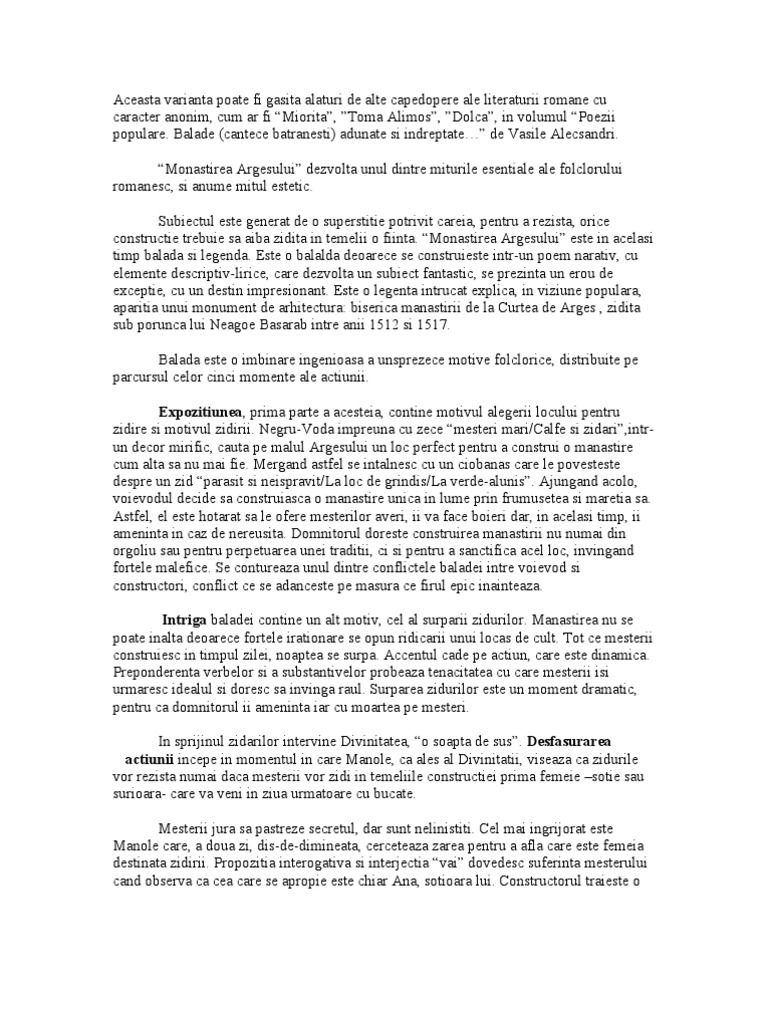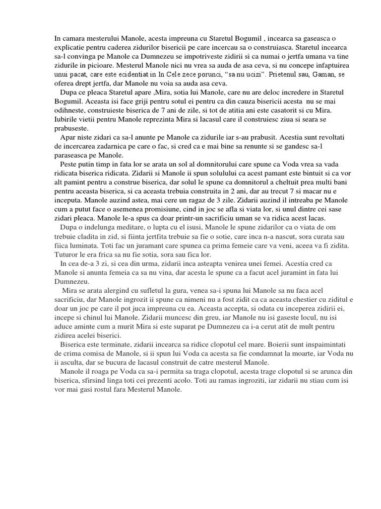 Recomandăm realizarea rezumatului pe scurt al baladei meșterul manole ținând cont de structura sa și adăugând pe alocuri elemente preluate din text. Manole este foarte obosit si isi da seama ca a fost doar o unealta in mana domnului. Il anunta pe manole ca tara e ingrozita de aceasta jertfa si ca in sobor multe glasuri s au ridicat impotriva lui. Referat despre mesterul manole povestirea pe momentele subiectului momentul culminant este infaptuirea jertfei manole a acceptat jertfa.