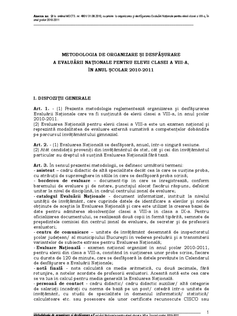 Metodologie organizare desfasurare evaluarea nationala 2011 anexa nr. 4267 841 2020 pentru stabilirea unor masuri de prevenire si combatere a imbolnavirilor cu sars cov 2. 14 09 2020 evaluarea națională pentru elevii clasei a viii a en viii reprezintă modalitatea de evaluare externă sumativă a competențelor dobândite pe parcursul învățământului gimnazial examenul se desfașoară anual într o singură sesiune. 1 prezenta metodologie reglementează organizarea şi desfăşurarea evaluării naţionale care va fi susţinută de elevii clasei a viii a în anul şcolar 2010 2011.