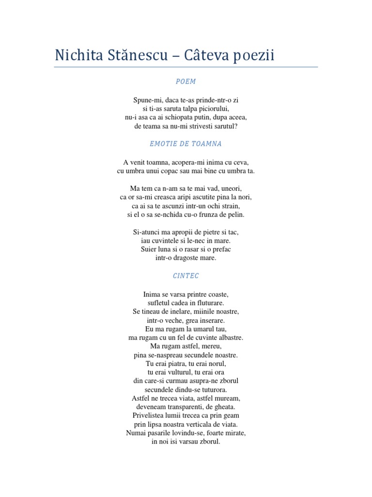This page is dedicated to nichita stănescu one of the greatest poets of mankind. Nu vrei să cumperi un câine. Nu i am spus că eu am tradus versurile lui nichita. Tânărul n a spus nimic decât versurile lui nichita până la capăt.