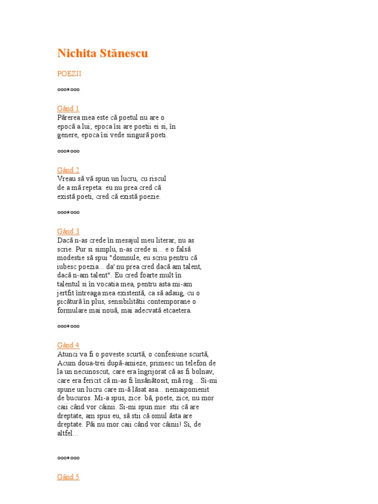 Mi a spus cineva nichita stanescu. Lasa ti frate unghia n pace daca ai cumva un ochi in virful ei de ce sa l spargi si totusi si totusi poarta asta dintre mine si tine trebuie zguduita de cineva. Nu vrei să cumperi un câine. Ascultă moşule tu să nu mă întrerupi pe mine când eu recit marele poet nichita stănescu. Nichita stanescu romanian poet and essayist winner of the herder.
