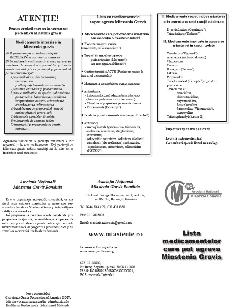 2 1 medicaments surgical treatment and other therapeutic measures pyridostigmine mestinon an anti cholinesterase ache drug is the usual first line treatment for mg. Medicamente care pot exacerba miastenia sau evidenţia o miastenie latentă l blocante neuromusculare. Iar medicii trebuie să cunoască aceste medicamente interzise să fie atenți cu prescrierea lor. Pacienţi cu miastenia gravis medicamente interzise în miastenia gravis lista cu medicamentele ce pot agrava miastenia gravis i.