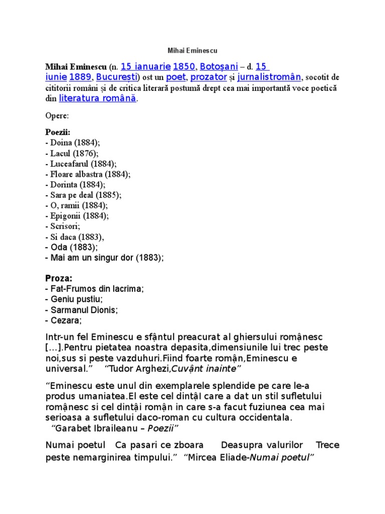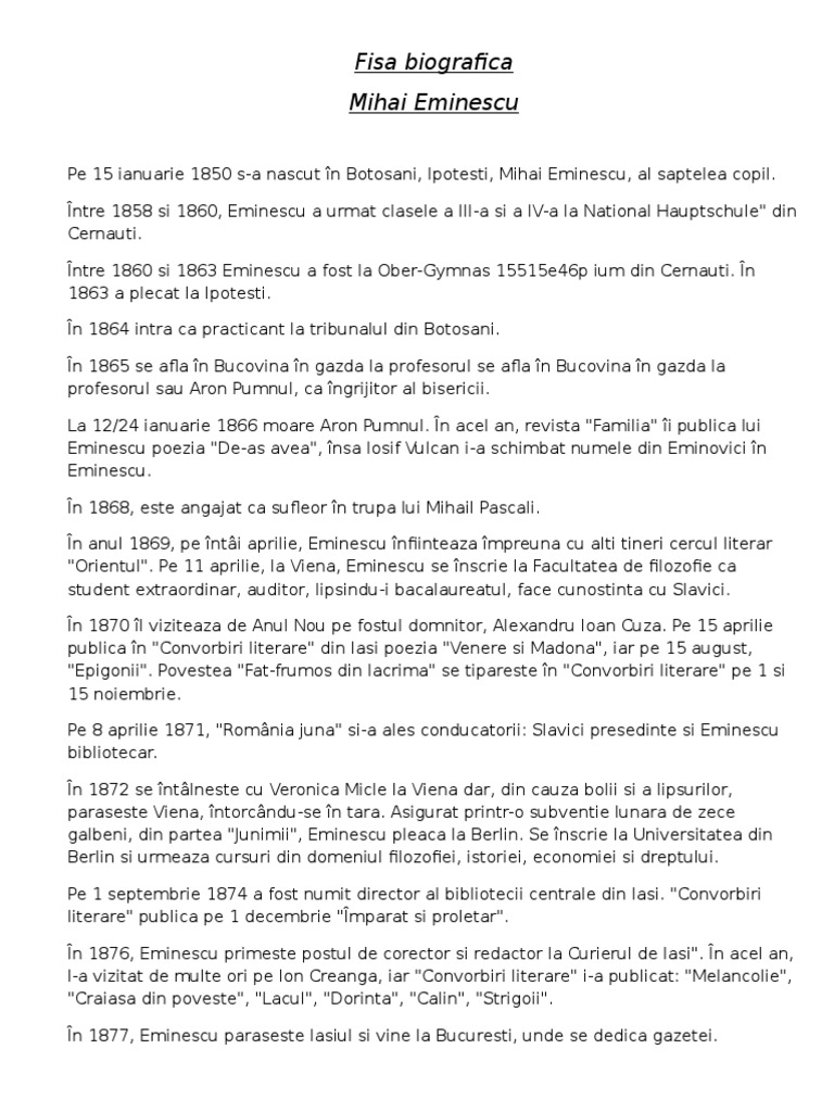 Mihai eminescu fisa de autor. 0 stele 0 review uri. Eminescu was an active member of the junimea literary society and worked as an editor for the newspaper timpul the time the official newspaper. 15 january 1850 15 june 1889 was a romanian romantic poet novelist and journalist generally regarded as the most famous and influential romanian poet. Fisa de lucru creat pentru un proiect educational mie mi a fost de mare folos sper ca si voua.