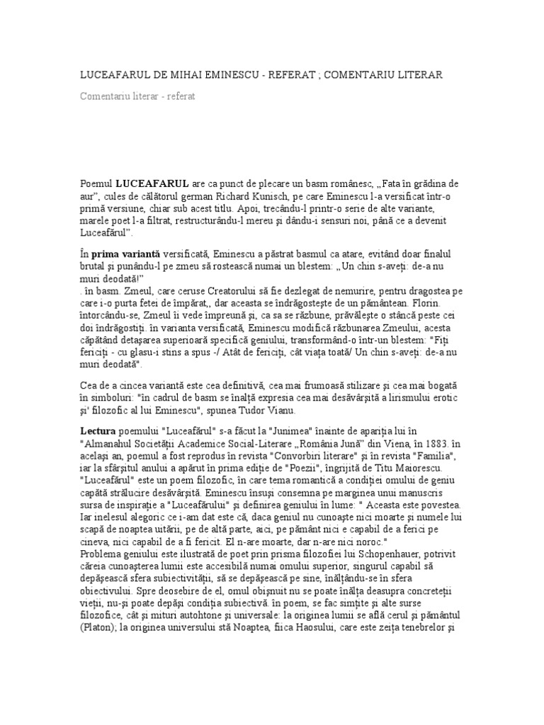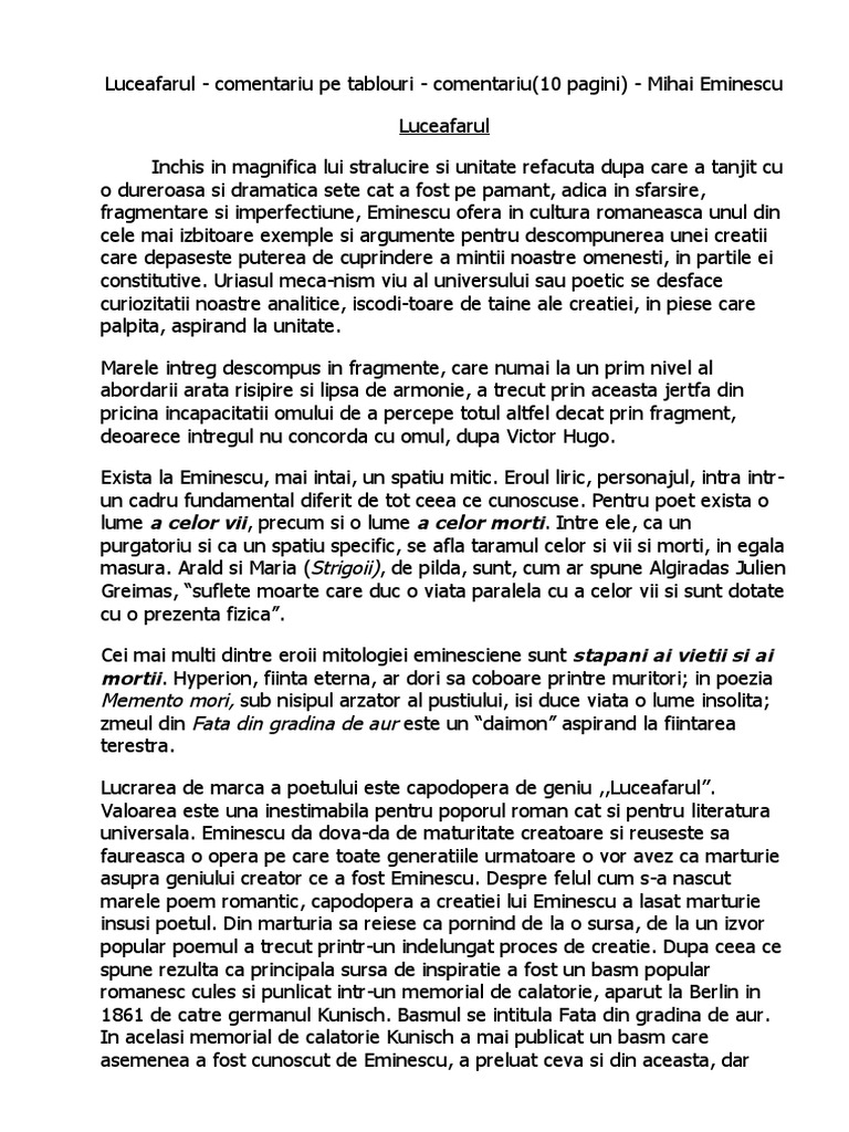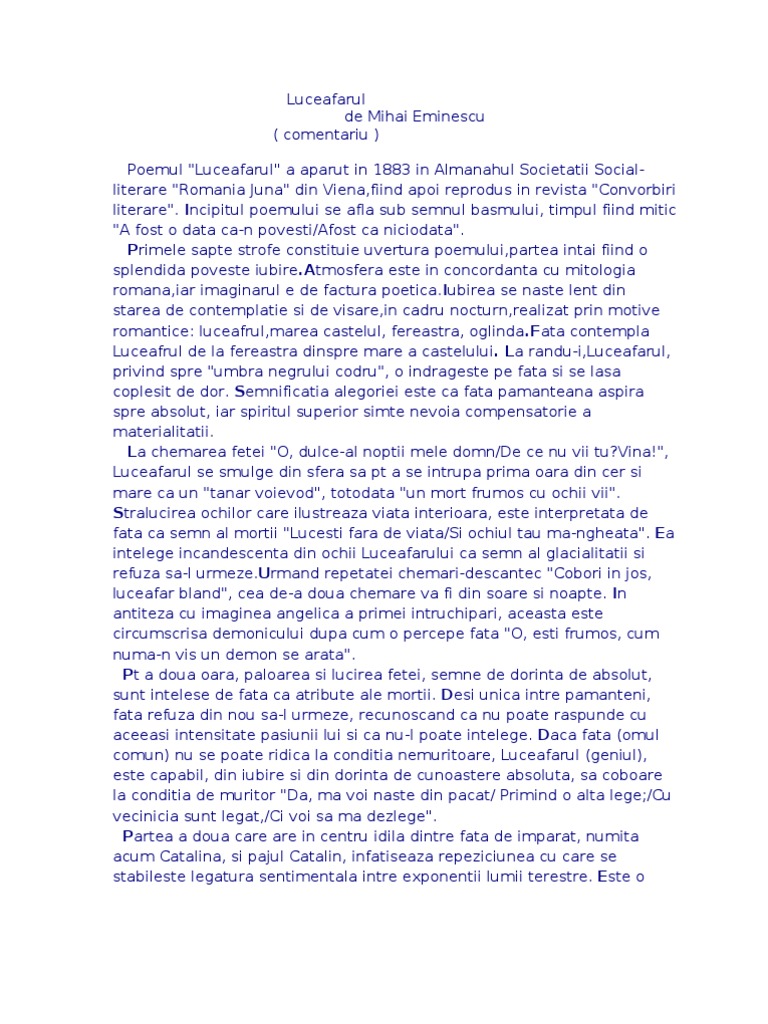 Mihai eminescu luceafarul comentariu. Luceafărul de mihai eminescu comentariu literar rezumat literar crispedia ro vladimir streinu şi nu numai el socoteşte că între legendele noastre dintre care mioriţa şi mănăstirea curţii de argeş care ne recomandă ca popor în faţa eternităţii legenda luceafărului ocupă un loc particular. în manuscrisele sale eminescu. Mihai eminescu a fost poet prozator si jurnalist roman socotit de critica literara si de cititori drept cea mai importanta voce poetica a literaturii romane. Odă în metru antic mortua est glossă scrisoarea i nu în ultimul rând poate c ea mai importantă creație poetică eminesciană trebuie amintit poemul filosofic.