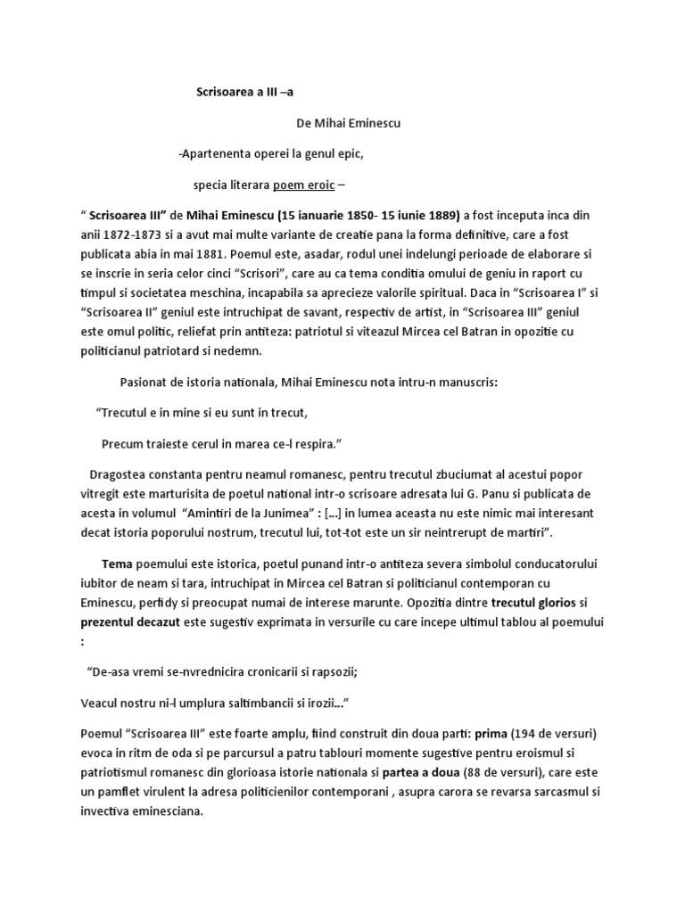 Mihai eminescu scrisoarea 3. Codrul clocoti de zgomot şi de arme şi de bucium iar la poala lui cea verde mii de capete pletoase mii de coifuri lucitoare ies din umbra ntunecoasă. Vede cum din ceruri luna luneca si se coboara. Scrisoarea iii de mihai eminescu a fost începută încă din anii 1872 1873 şi a avut mai multe variante de creaţie până la forma definitivă care a fost publicată abia în mai 1881 poemul este aşadar rodul unei îndelungi perioade de elaborare şi se înscrie în seria celor cinci scrisori care au ca temă condiţia omului de geniu în raport cu timpul şi societatea meschină. Un sultan dintre aceia ce domnesc peste vro limba ce cu a turmelor pasune a ei patrie s o schimba la pamant dormea tinandu si capatai mana cea dreapta.