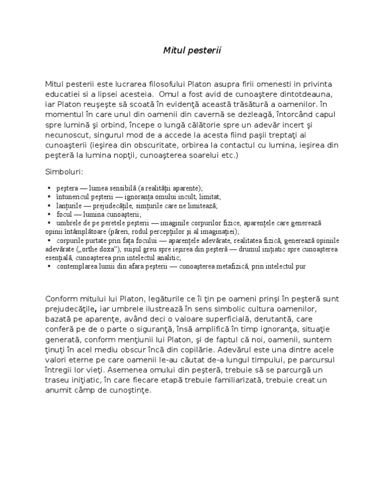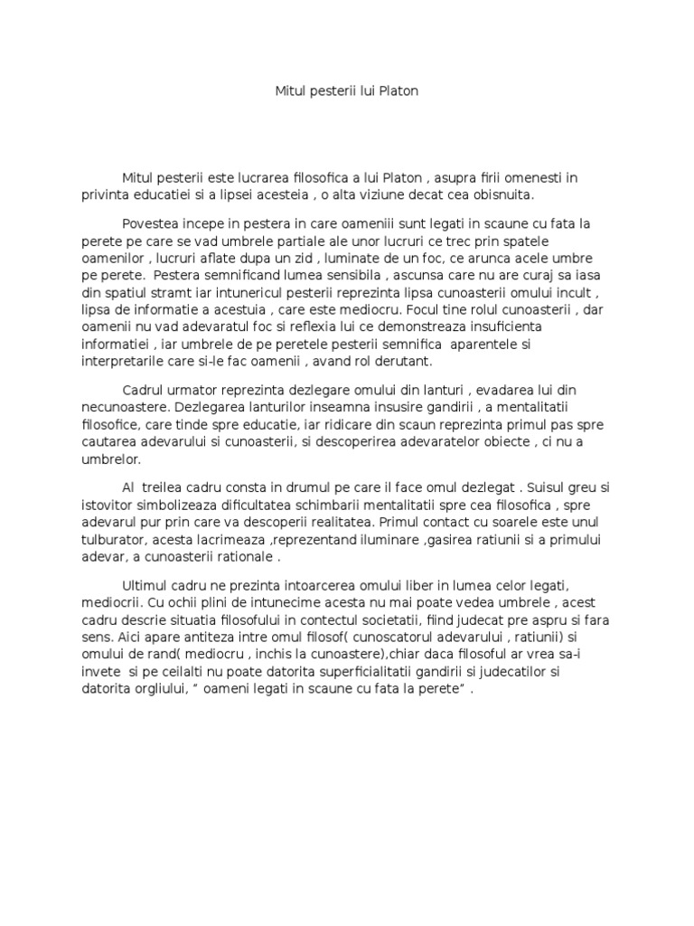 Platon însuşi impune mitul peşterii în viaţa de zi cu zi oamenii care n au văzut niciodată dreptatea însăşi dar sunt siliţi să se confrunte cu umbrele dreptăţii în tribunale care va fi transpus mai târziu magistral în cinematograf de emir kusturica în filmul de referinţă underground skutski 2005. Astazi o regasim într o teza freudiana care face distinctie între continutul constient al visului si continutul latent la care se ajunge prin efort pornind de la cel constient. Mitul peşterii extras integral din republica lui platon editura ştiinţifică şi enciclopedică bucureşti 1986 socrate. Asemuieşte firea noastră în privinţa educaţiei şi a lipsei de educaţie cu următoarea pdftoword on line întâmplare.