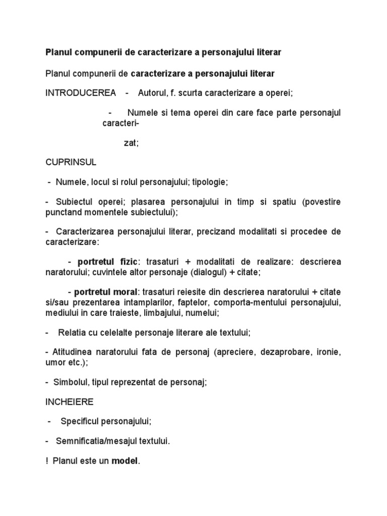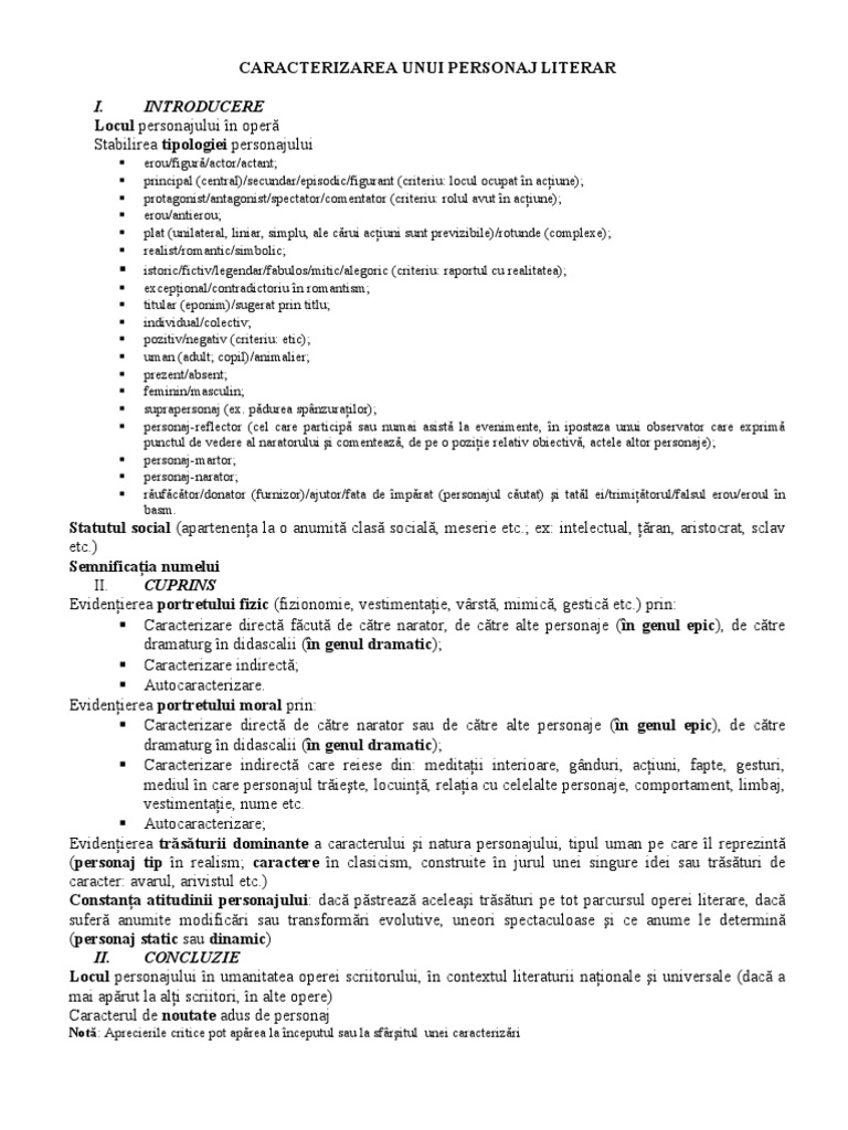 Trebuie să vie îndată și o s o cunoști. Imum 400 de cuvinte în care să prezinți particularităţi de construcție a unui personaj dintr un roman psihologic studiat. Tipul de personaj uman nonuman individual colectiv principal secundar pozitiv negativ dinamic pasiv adult copil model antimodel. Fisa de caracterizare a unui personaj literar etape necesare in caracterizare.