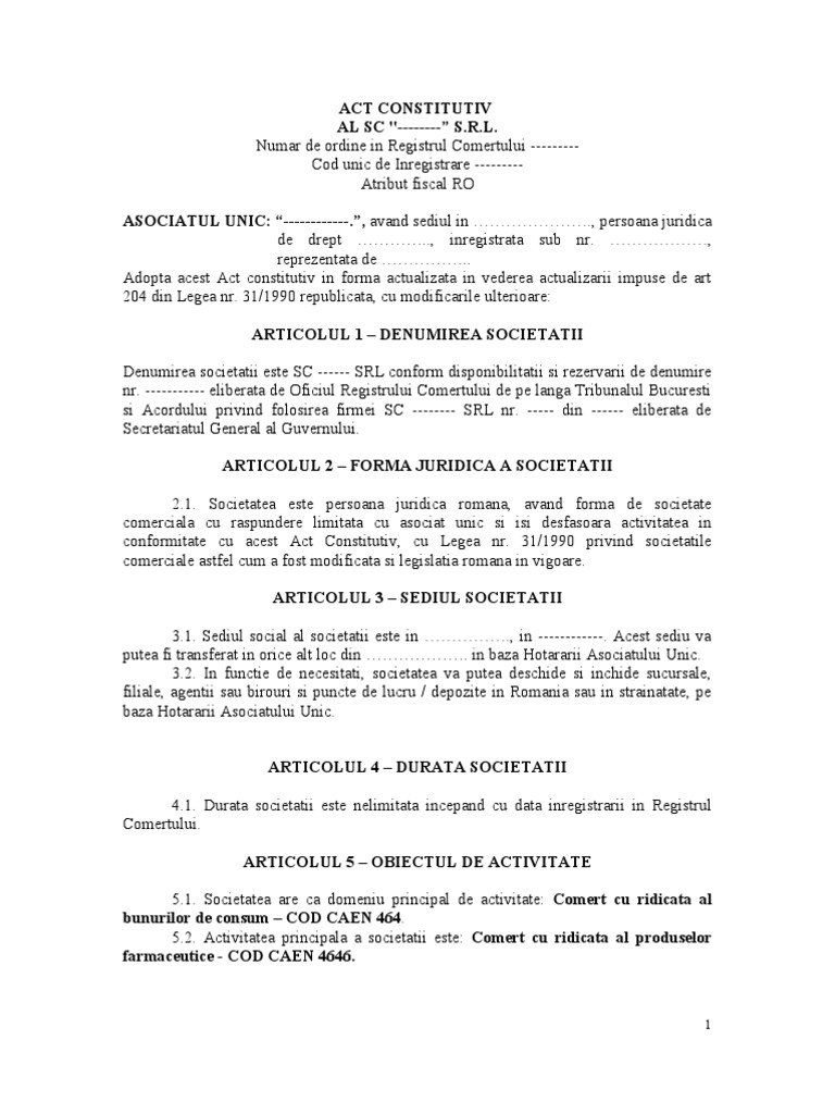 Asociat unic prezentul act are caracter informativ. Act constitutiv srl cu asociat unic. Act constitutiv societate cu raspundere limitata asociat unic repararea prejudiciului cauzat de cladiri. Documentul contine clauze complexe cu diferite variante pentru cele mai diverse situatii concrete precum si multe note explicative extrem de utile pentru intelegerea articolelor pe care trebuie sau este bine sa le inserati in cuprinsul sau.