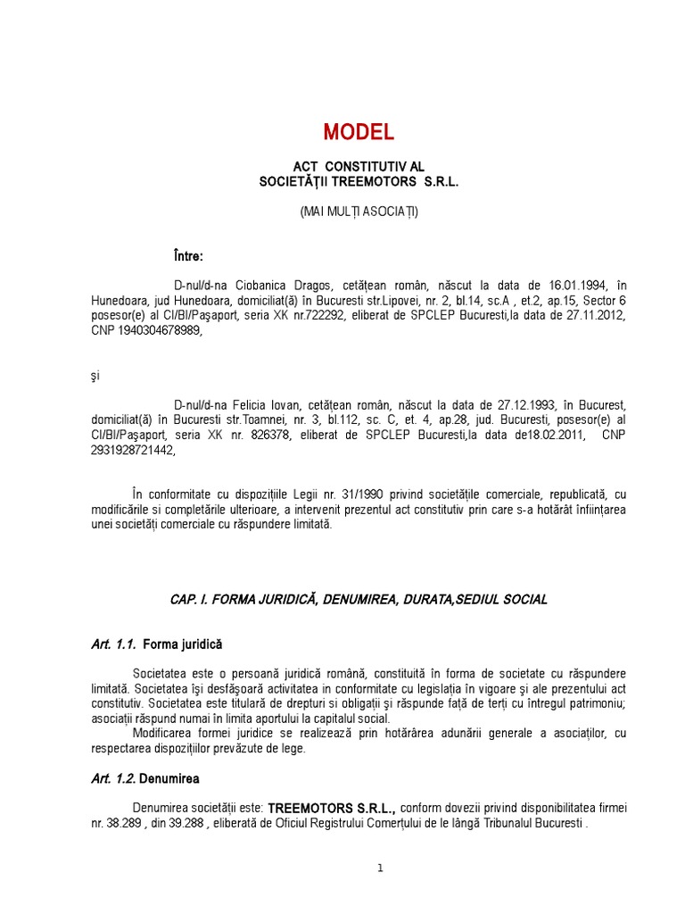 Model act constitutiv asociat unic model act constitutiv mai multi asociati infiintare firma srl infiintare persoana fizica autorizata pfa deschidere punct de lucru majorare capital social dizolvare firma radiere firma suspendare activitate firma inregistrare marci formulare onrc persoane juridice formulare onrc persoane fizice. Adeverinta pentru studentii ce intrunesc toate conditiile si doresc sa beneficieze de facilitatile legale ce li se ofera. Ma poate ajuta cineva cu un model referitor la aceasta. Act constitutiv capitolul i denumirea forma juridica sediul si durata societati art.