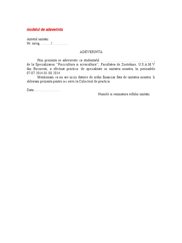 Stagiul de practica sau internship este recunoscut numai daca in urma acestuia a fost eliberata o adeverinta de catre unitatea in care s a desfasurat activitatea. Model de ro sau catalogul modelelor este site ul unde vei gasi o multitudine de informatii utile. De obicei in relatia cu institutiile statului avem nevoie de tot felul de adeverinte. Adeverinţa de practică prin prezenta se adevereşte că.