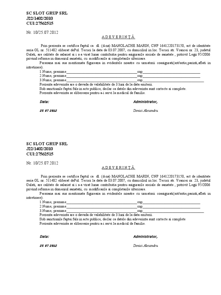 Model adeverinta salariat pentru medic. Model cerere privind furnizarea listei serviciilor medicale conform ordin ms cnas nr. Zile libere pentru părinții ai căror copii învață în scenariile 2 și 3. 903 2007 pentru modificarea şi completarea normelor metodologice privind stabilirea documentelor justificative pentru dobândirea calităţii de asigurat respectiv de asigurat fără plata contribuţiei precum şi pentru aplicarea măsurilor de executare silită pentru încasarea. 1 din ordinul cnas nr.
