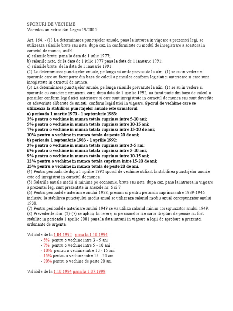 2 din lege sunt cele prevazute in anexa nr. Aceste sporuri se utilizează la determinarea punctajului mediu anual atât pentru perioadele anterioare cât şi pentru cele ulterioare datei de 1 aprilie 1992 data intrării în vigoare a prevederilor legii.