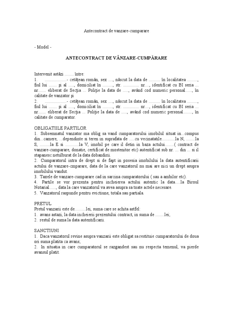 Vrem sa incheiem un antecontract de vanzare cumparare cu un dezvoltator. Model de antecontract de vânzare cumpărare a unui apartament numit și promisiune de vânzare cumpărare sau precontract model conform noului cod civil care se încheie în formă autentică la notariat. Detin un teren extravilan care urmeaza sa fie parcelat si incheiat un contract de vanzare cumparare. Gabilioiu utilizator 16 33 10 septembrie 2012.