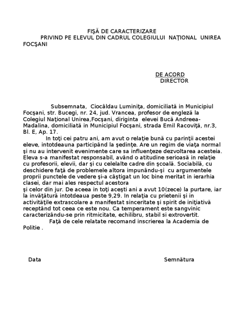 0 stele 0 review uri. Fisă de caracterizare psiho pedagogică pentru tribunal. 13 septembrie 2010 11 01. De inregistrare intotdeauna o stampila antet dupa caz si o semnatura a reprezentantului respectiv.