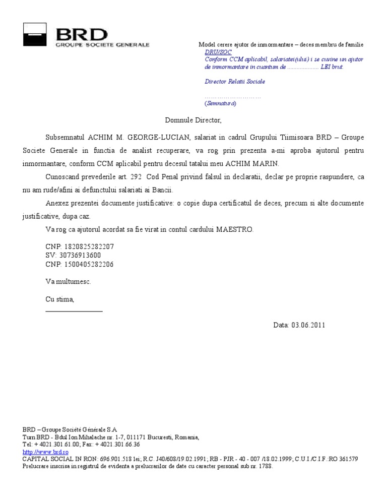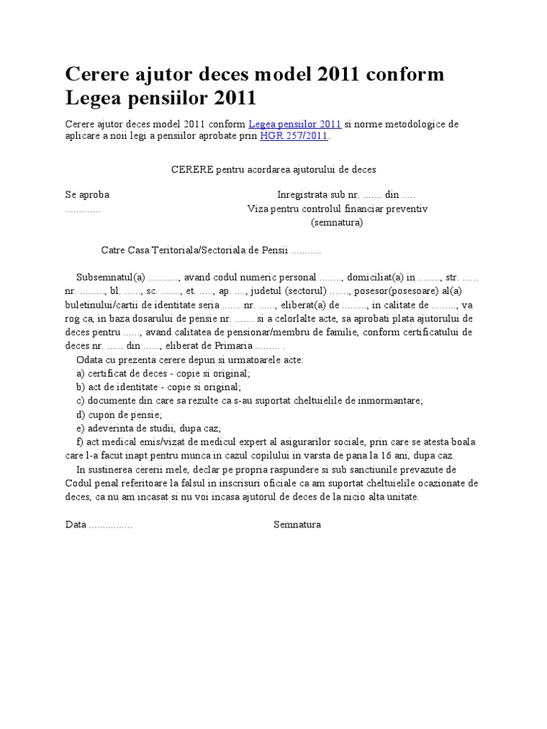 Model cerere ajutor deces catre angajator. Cerere pentru plata ajutorului de deces sumelor ramase neincasate de catre author. Adeverinta de la angajator ca defunctul a fost salariat pana la data decesului si nu a beneficiat de concediu fara salariu absente nemotivate etc. Mama intentioneaza sa depuna o cerere pentru acodarea ajutorului de deces la fostul angajator al tatalui meu decedat. E documente din care sa rezulte ca s au suportat cheltuieli ocazionate de inmormantare facturi pe numele.