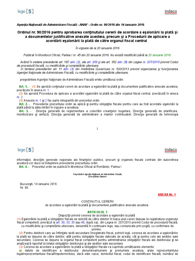 Buna ziua ma poate ajuta si pe mine cineva cu un model de cerere de mentinere a esalonarii la plata a impozitelor catre anaf. 2 procedura de aplicare a acordării eșalonării la plată de către organul fiscal central la ordinul președintelui agenției naționale de administrare fiscală nr. Alin 13 1 din anexa nr 2 la ordinul pre ședintelui agen ției na ționale de administrare fiscal ă nr 90 2016 pentru aprobarea con ț inutului cererii de acordare a e ș alon ă rii la plat ă ș i a documentelor justificative anexate acesteia precum ș i. 1 conținutul cererii de acordare a eșalonării la plată și documentele justificative anexate acesteia și a anexei nr.