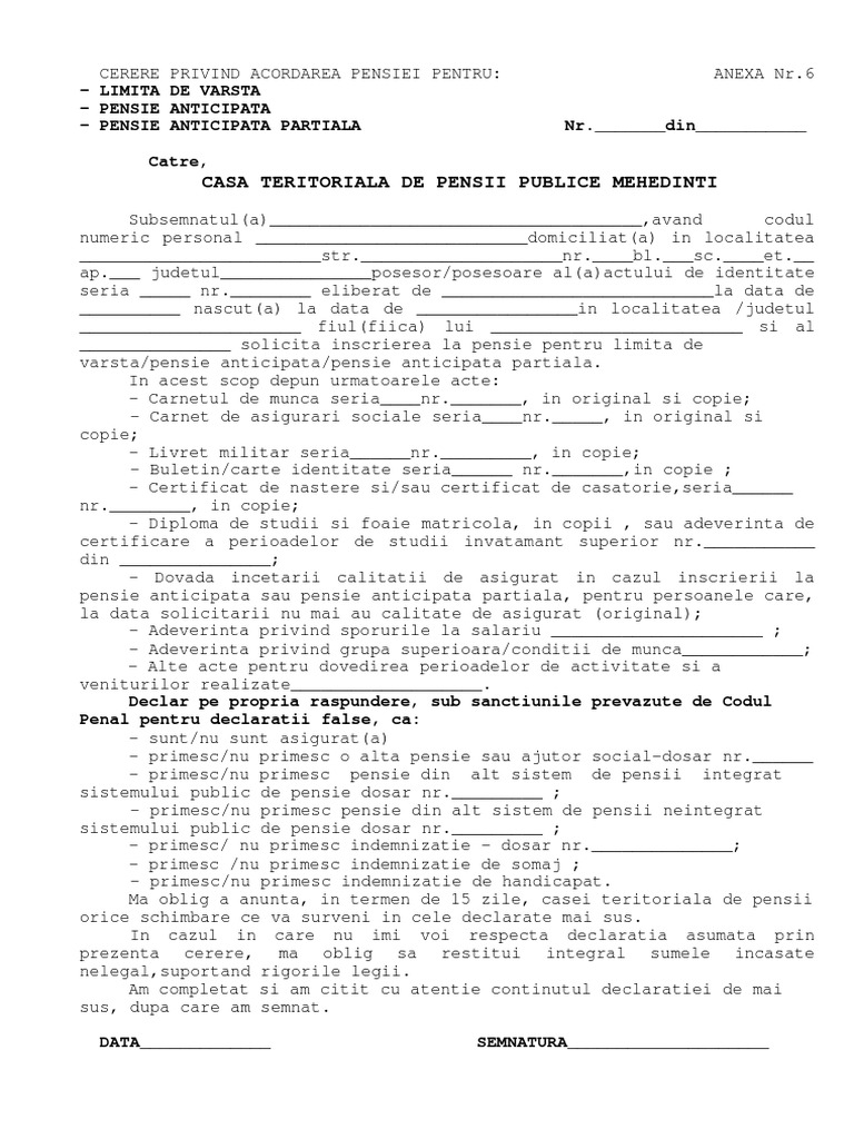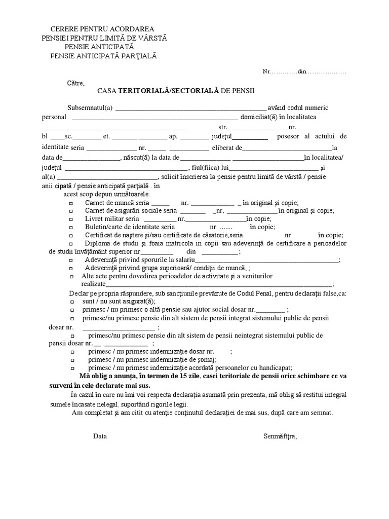Cerere tip pentru înscrierea la pensie. Cerere pentru acordarea pensiei de limita de varsta pensiei anticipate pensiei anticipata partiala. Câte cătune au bancomate în românia. Original si copie carnetul de.