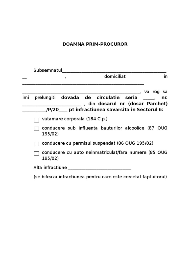 Vä rog sä binevoiti a mi aproba prelungirea dovezii de circulatie pe drumurile publice seria eliberatä de i p j. Salut eu am facut cerere si la judecatorie la fel ca la parchet doar ca la judecatorie dureaza un pic mai mult fata de parchet. P 20 pentru sävârsirea infractiunii prev. Articole din cerere prelungire dovada scrise de e avocat.