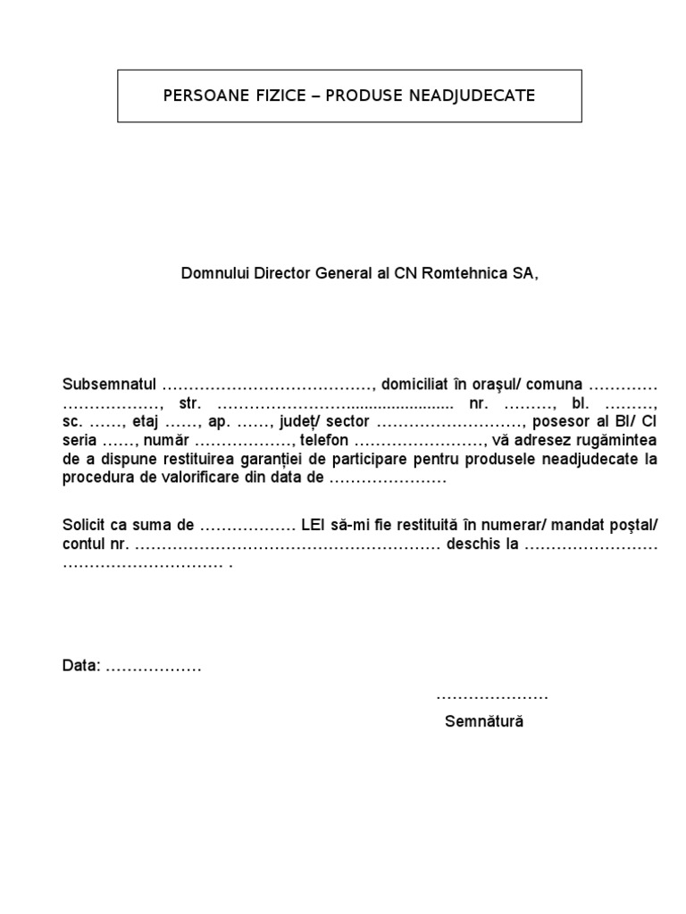 Model de cerere bunuri confiscate sau ridicate la percheziție. Regăsiți atașat un model de cerere pentru restituirea sau transferul unor sume de bani descarcă în format docx sau pdf. Restituirea unei sume achitate în plus 2. Procedura de restituire a sumelor reprezentând taxe sau alte venituri ale bugetului de stat plătite în plus sau necuvenit şi pentru care nu există obligaţia de declarare a fost actualizată recent odată cu publicarea în monitorul oficial partea i nr.