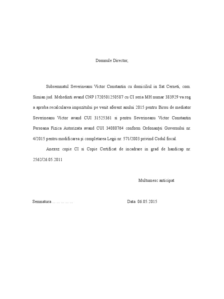 Cerere restituire impozit handicap grav sau accentuat domnule director subsemnatul a. 46 titlul iii. Titlul i dispozitii generale 2020 art. La direcția de impozite și taxe locale scutire de la plata impozitului taxei pt.