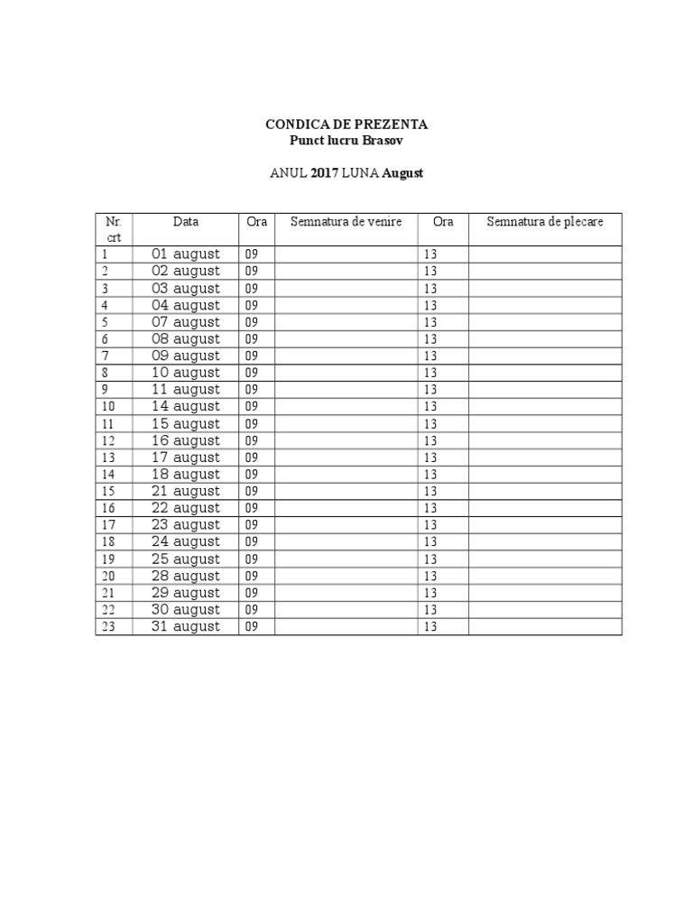 Model Condica De Prezenta August 2017