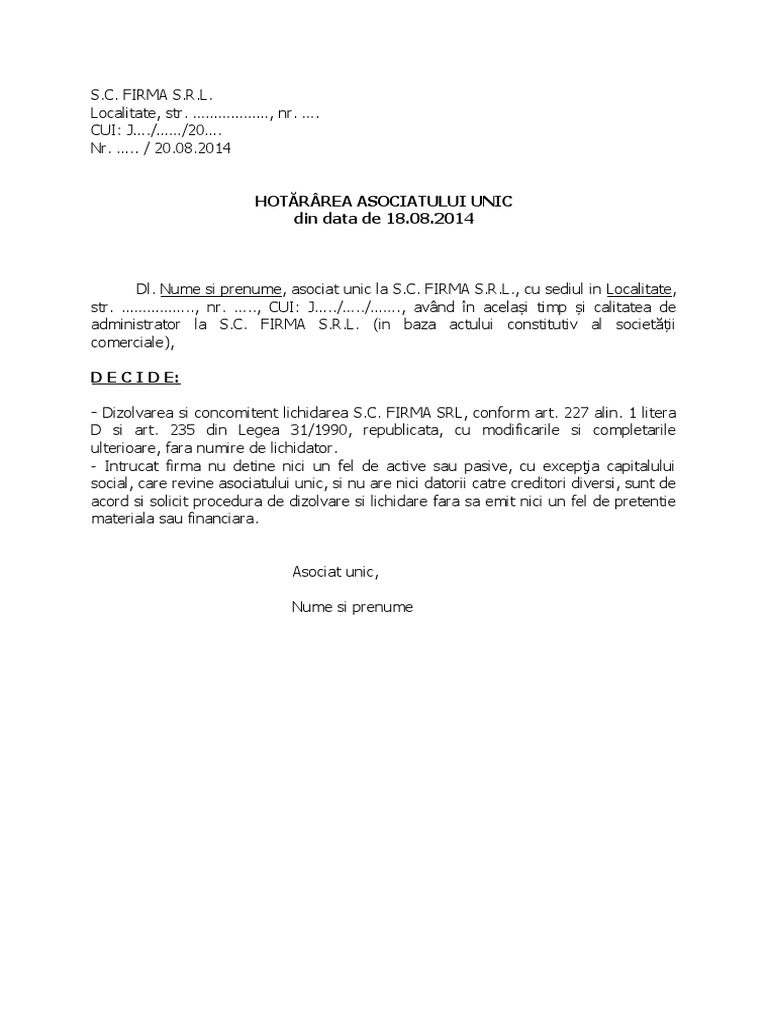 31 1990 republicată cu modificările şi completările ulterioare. Related items aga asociat unic decizie asociat unic decizie de repartizare active dizolvare firma cu asociat unic lichidare monitorul oficial registrul comertului. Oficiul national al registrului comertului. Decizie asociat unic aspecte teoretice titlul iv modificarea actului constitutiv capitolul i dispoziţii generale art.