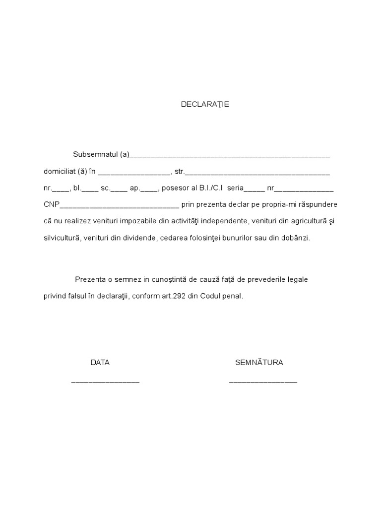 Model declaratie ca nu am venituri. Sub sanctiunile prevazute de codul penal pentru fals in declaratii ca nu am loc de munca nu realizez venituri sau realizez din activitati autorizate potrivit legii venituri mai mici decat. Model declaratie pe proprie raspundere. Potrivit ordinului 3060 2014 privind aprobarea conditiilor de organizare a taberelor excursiilor expeditiilor si a altor activitati de timp liber este necesar ca elevii sa completeze o declaratie. Declaratia autentica se face la un notar public si costa cca 20 si notarul stie ce trebuie sa scrie in declaratie.