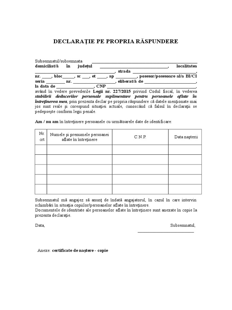 Declaratie pe propria raspundere a salariatului privind situatia proprie. In vederea angajarii unei persoane provenind din randurile somerilor angajatorul are obligatia de a inainta agentiei judetene de ocupare a fortei de munca o cerere de repartitie. Declarația contribuabilului cu privire la persoanele aflate în întreținere precum și acolo unde este cazul declarația persoanei aflată în întreținere sunt necesare pentru stabilirea deducerii personale a salariatului. Judetul codul numeric personal declar pe propria raspundere ca datele mentionate mai jos sunt reale cunoscând ca falsul în declaratii se pedepseste conform legii.