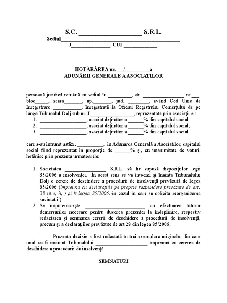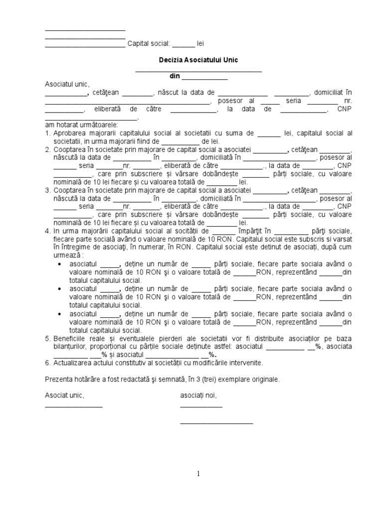 Hotararea asociatilor asociatului unic s author. Aschiopu last modified by. Kontra utilizator 12 19 24 aprilie 2017. Majorarea capitalului social și cooptarea ca asociat a persoanei din afara societății.
