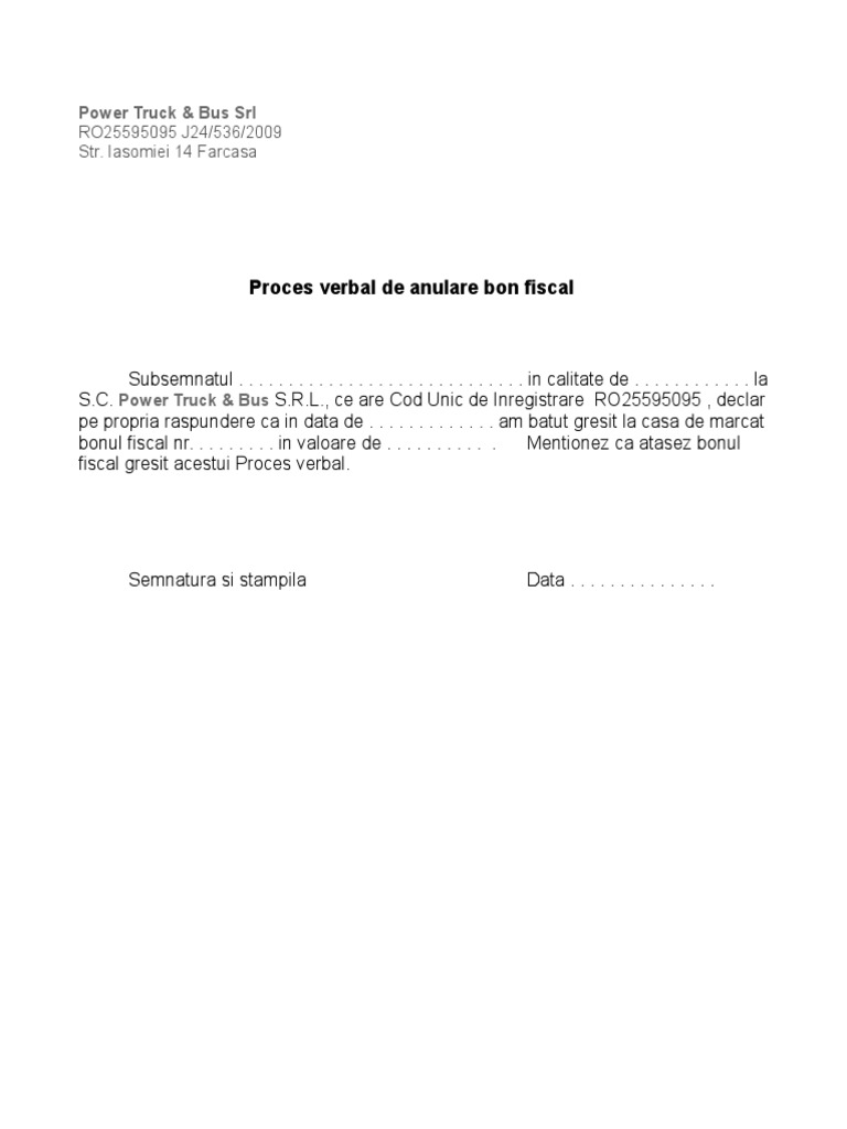 Model proces verbal anulare bon fiscal 2019. Www ecr distribution ro proces verbal de anulare bon fiscal subsemnatul. In calitate de angajat al. In calitate de. Una dintre cele mai importante obligativitati care le sunt atribuite operatorilor economici este utilizarea aparaturii fiscale omologate in vederea emiterii bonului fiscal sau dupa caz a facturilor.