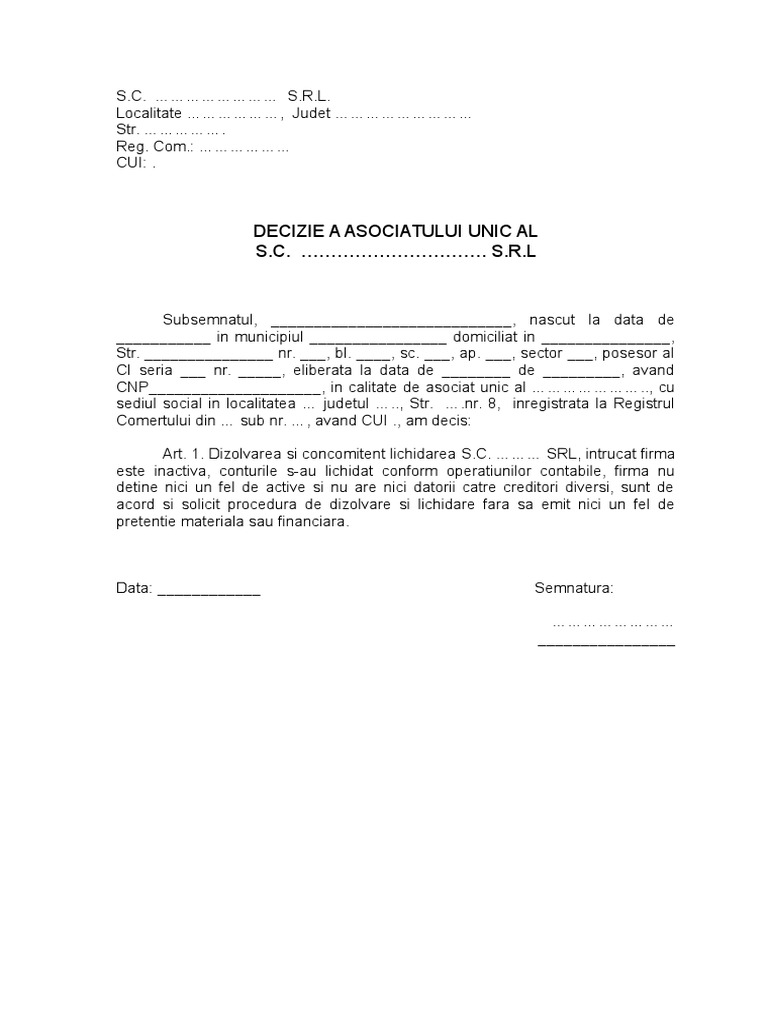Semnata de catre asociat model declaratie asociat cu fara activitate la sediu. Model hotarare asociat unic bilant 31 12 2017 situatii financiare anuale raport proces verbal pentru adunare generala asociați acționari bilanț 31 12 2017 model pentru situație. Raport contabil de lichidare la x srl. In situatia urmatoare asociatul unic al societatii a hotarat lichidarea voluntara a firmei la onrc.