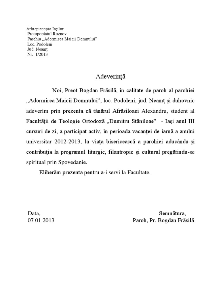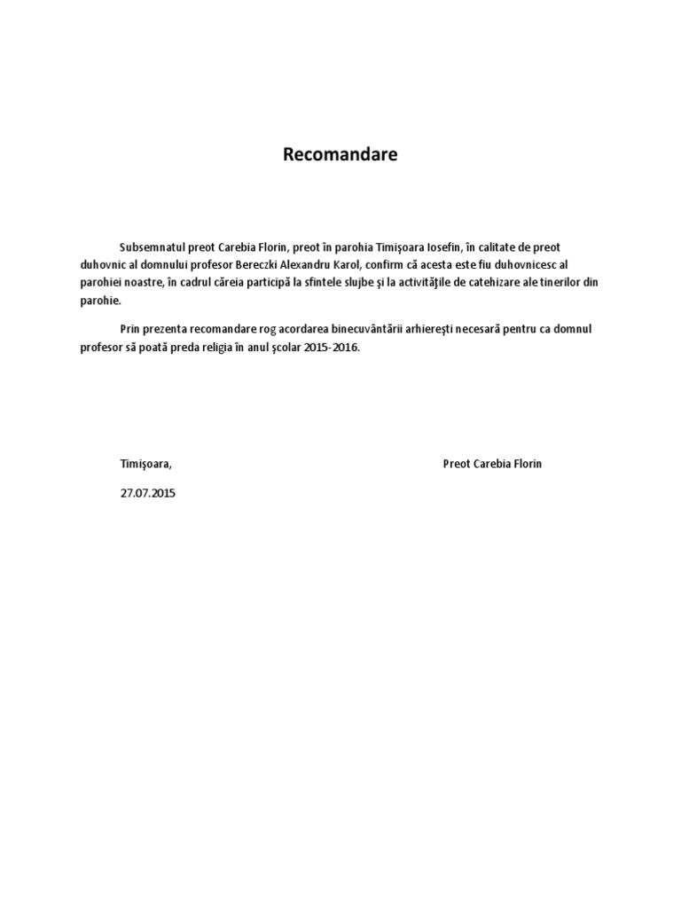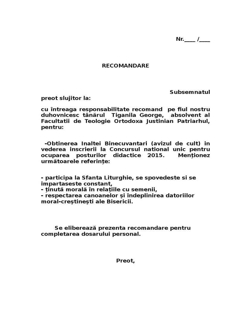Va sti ce sa scrie acolo. 100 100 au considerat acest document util. Din recomandare subsemnatul preot împreună cu consiliul parohial al. Un preot tânăr blând dar un duhovnic foarte bun şi înţelept.