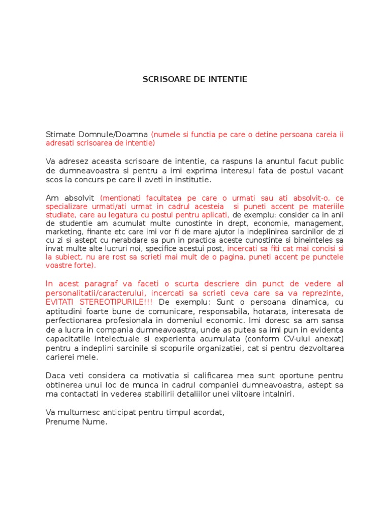 Pe site ul www bestjobs ro am placerea sa imi incerc sansa pentru postul de. Scrisoarea de intentie care iti poate aduce un job vara aceasta targul virtual hipo ro pentru absolventi iulie 1 2015 iulie 1 2015 admin afla care este diferenta pe care o face scrisoarea de intentie si cum o poti folosi pentru a ti asigura un job vara aceasta. Vezi mai jos un model de scrisoare de intentie in limba romana. Acest model de scrisoare de intentie este recomandat mai ales in mediile formale cum ar fi banci si companii de stat sau pentru joburi cu un mare grad de responsabilitate siseriozitate al doilea model de scrisoare de intentiestimate domnule doamna subsemnatul prenume nume am luat la cunostinta cu interes de posibilitatile pe carele ofera compania dumneavoastra.