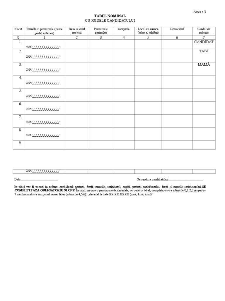 Model tabel nominal cu rudele candidatului completat. Numele şi prenumele cnp gradul de rudenie data şi locul naşterii prenumele părinţilor ocupaţia profesia funcţia. Gradul de rudenie. In tabel vor fi trecuti in ordine. Numele prenumele cnp nume purtat anterior data şi locul naşterii prenumele părinţilor ocupaţia locul de muncă.