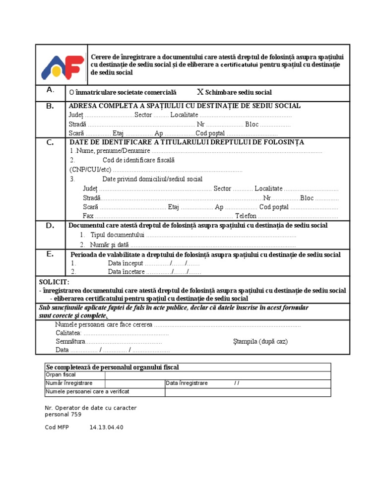 Modificare sediu social anaf. Perioada de valabilitate a dreptului de folosintä asupra spatiului cu destinatie de sediu social l. Domiciliul sediul social locul de desfăşurare efectivă a activităţii principale. Cine depune formularul 050 privind domiciliul sau sediul social. In baza acestei declaratii organele fiscale demareaza procedura de modificare a domiciliului fiscal la noul sediu social care implica si transferul dosarului fiscal intre cele doua organe fiscale in cadrul careia se comunica societatii certificatul de atestare fiscala si decizia de inregistrare a sediului social si a domiciliului fiscal.