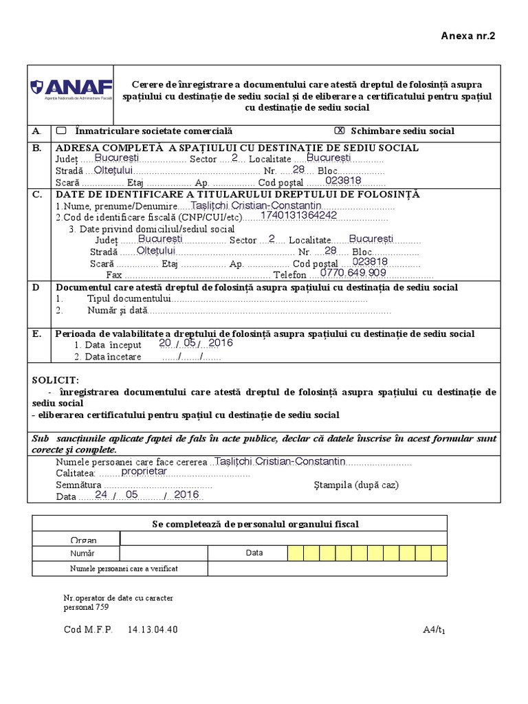 De altfel o astfel de procedură se desfăşoară la registrul comerţului şi presupune parcurgerea anumitor paşi pe care îi vom prezenta în cele ce urmează. Trebuie sa anunt anaf. 06 octombrie 2020 40 11 tone de tutun confiscate de inspectorii antifraudă în luna septembrie în cadrul acțiunii de monitorizare a traficului de tutun prin frontierele ue începută în luna septembrie inspectorii direcției generale antifraudă fiscală din cadrul agenției naționale de administrare fiscală au confiscat în perioada 25 27 septembrie 20 4 tone de tutun brut. înregistrarea documentului care atestä dreptul de folosintä asupra spatiului cu destinatie de sediu social eliberarea certificatului pentru spatiul cu destinatie de sediu social.