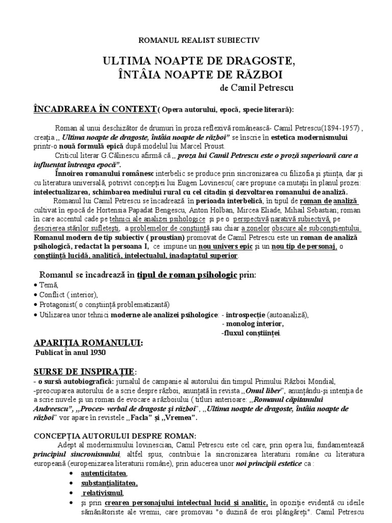 Romanul subiectiv modern ultima noapte de dragoste întâia noapte de război de camil petrescu romanuleste specia genului epic în proză de mare întindere cu acţiune complexă care se poate desfăşura pe mai multe planuri cu personaje numeroase bine individualizate. Ultima noapte de dragoste întâia noapte de război este un roman scris de camil petrescu și publicat în 1930 autorul surprinde drama intelectualului lucid însetat de absolutul sentimentului de iubire dominat de incertitudini care se salvează prin conștientizarea unei drame mai puternice aceea a omenirii ce trăiește tragismul unui război absurd văzut ca iminență a morții. Nu scriu decât ceea ce văd ceea ce aud ceea ce înregistrează simţurile mele. Ultima noapte de dragoste întâia noapte de război este şi un roman subiectiv prin naraţiunea este la persoana i naratorul fiind şi personaj al acţiunii literatura propusă de camil petrescu fiind una autentică bazată pe sondarea propriei conştiinţe a propriului eu.
