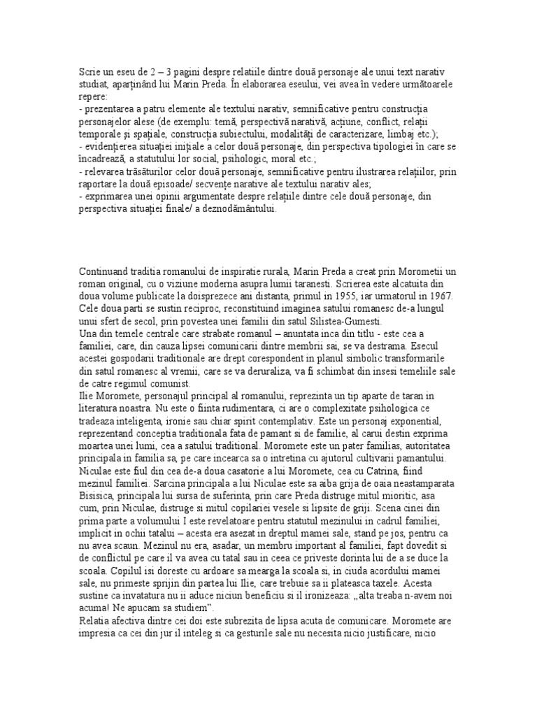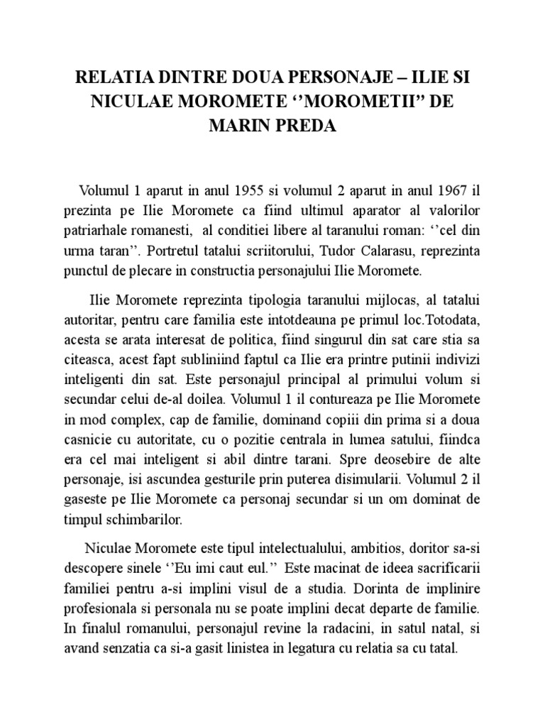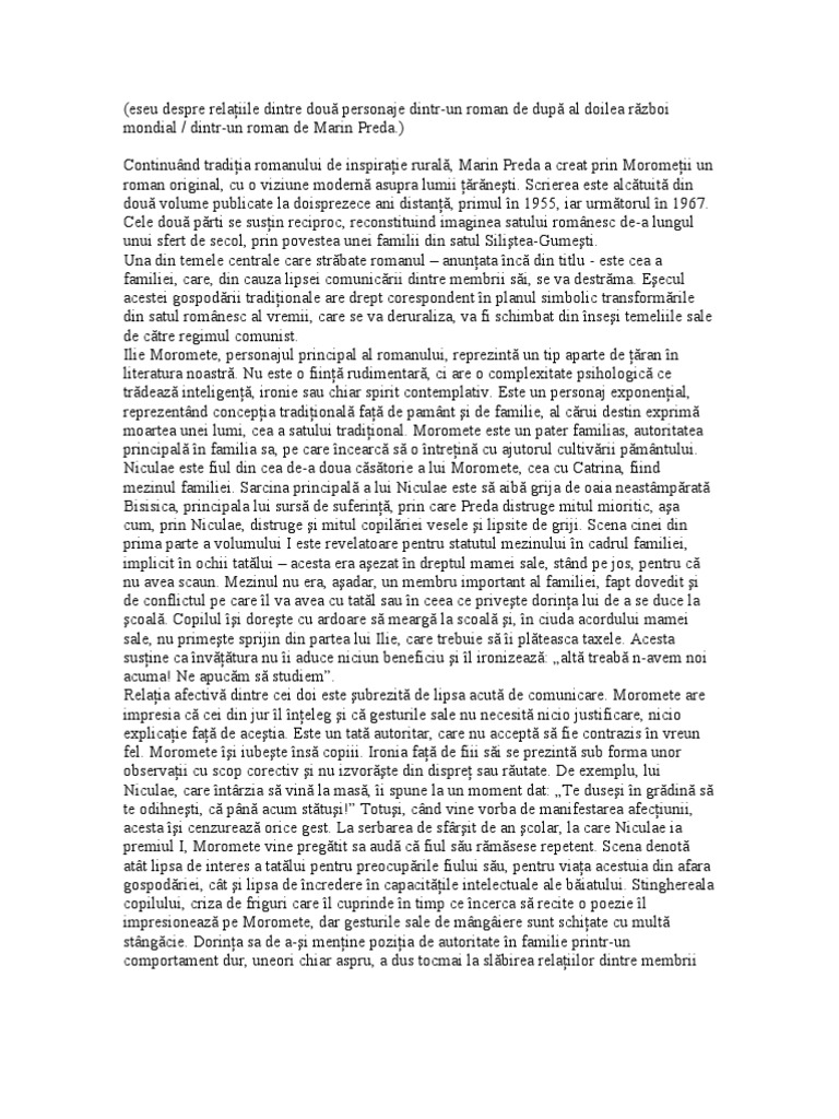 Morometii relatia dintre doua personaje. De asemenea acest material reprezintă și o variantă de soluționare a cerinței de a scrie un eseu în care să prezinți relația dintre două personaje dintr un roman studiat regăsită la sesiunea august septembrie a bacalaureatului. Incadrarea scriitorilor operelor sau a scriitorului in perioada literara. Desi iubitor la inceput tu stii ca mi esti draga din dorinta de a obtine din ce in ce mai multi bani pe parcursul povestirii el se schimba ajungand sa isi indemne sotia sa comita adulter joaca muiere parca are sa ti ia cineva din frumusete. Moromeții de marin preda este un roman realist postbelic în două volume cu elemente de modernitate care înfățișează în mod realist viața sătenilor din câmpia dunării înainte și după cel de al doilea război mondial.