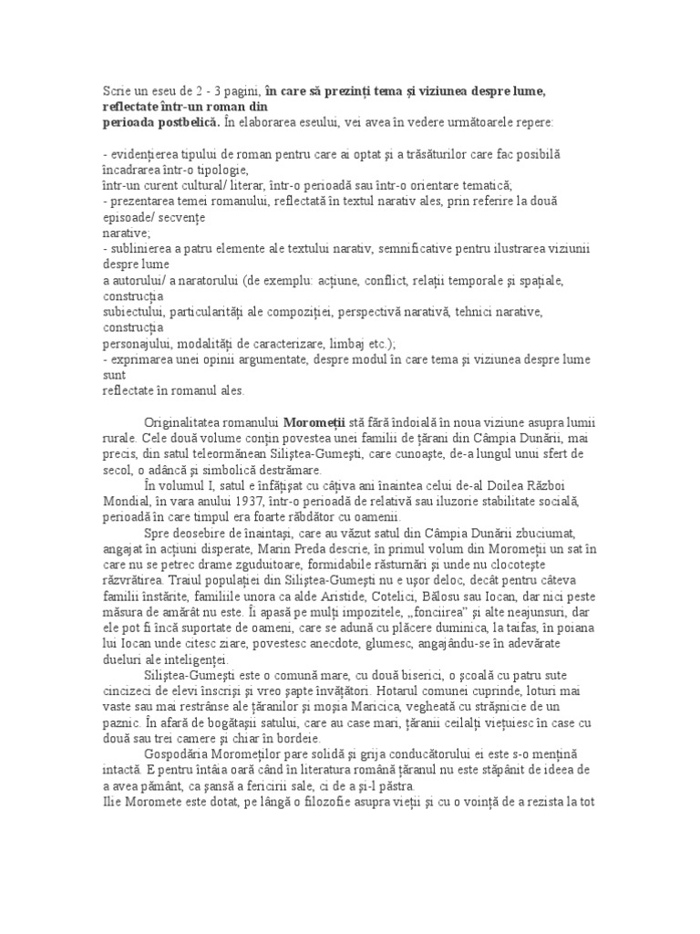 Eseu tema şi viziunea despre lume moromeţii de marin preda. Tema și viziunea despre lume reprezintă una dintre cele mai populare cerințe regăsite în cadrul subiectului al iii lea al examenului de bacalaureat la limba și literatura română așadar dacă ești în clasa a xii a și ai început să te pregătești pentru bac te sfătuim să citești și să încerci să înțelegi în mod logic modelele rezolvate de eseuri despre tema și. Titlul morometii asaza tema familiei in centrul romanului insa evolutia si criza familiei sunt simbolice pentru transformarile din satul romanesc al vremii astfel ca romanul unei familii este si un roman al deruralizarii satului n. N 1955 volumul i iar n 1967 volumul al ii lea proza lui marin preda se ncadraz n realismul postbelic iar romanul moromeii ilustreaz sfritul romanului doric.