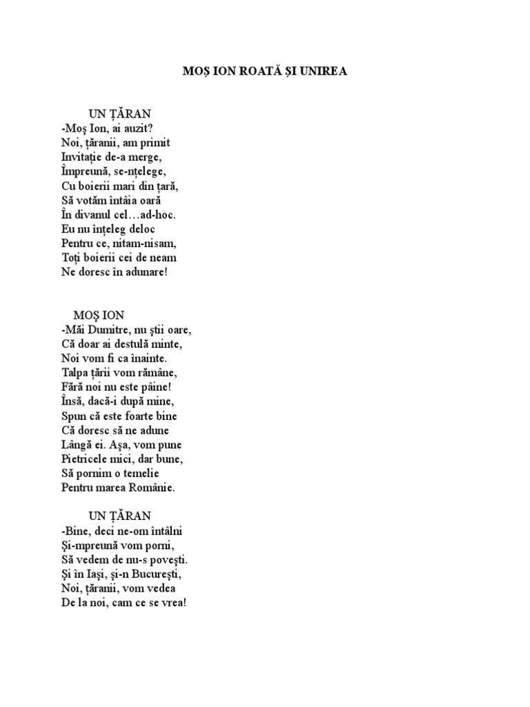 Mos ion roata si unirea pdf. Kogălniceanu şi alţii au găsit cu cale să cheme la adunare şi câţiva ţărani fruntaşi câte unul din fiecare judeţ spre a lua şi ei parte la facerea acestui măreţ şi nobil act naţional. Kogalniceanu și alții au gasit cu cale sa cheme la adunare și cațiva țarani fruntași cate unul din fiecare județ spre a lua și ei parte la facerea acestui mareț și nobil act național. Soft si design de bunicul grigore. Audiobook poveste audio mp3 dupa basmul mos ion roata si unirea.