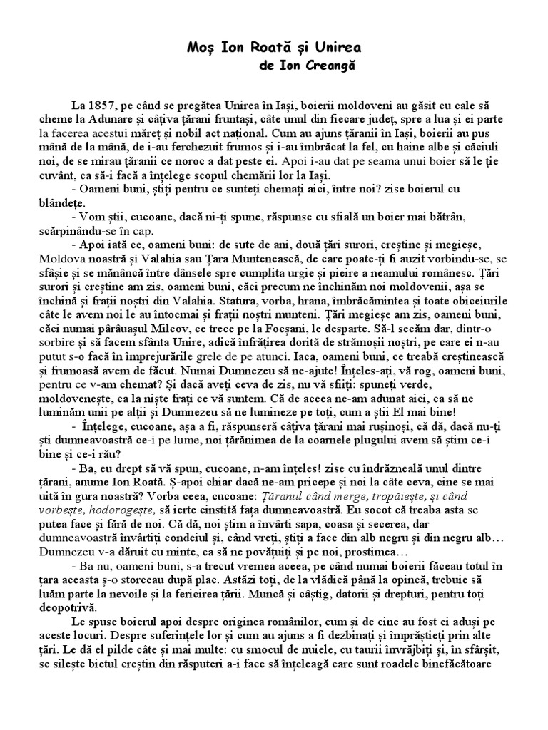 Citește online povestea pentru copii moş ion roată şi unirea scrisă de ion creangă citeste basmul moş ion roată şi unirea în care este vorba despre mos ion roata care cu vreo doi ani inainte de unirea principatelor române le explica la boieri care este diferenta intre a da ordin si a face. La 1857 pe când se ferbea unirea în iasi boierii moldoveni liberali ca de alde costache hurmuzachi m. 1857 pe cand se ferbea unirea în iași boierii moldoveni liberali ca de alde costache hurmuzachi m. 07 01 2012 23 29 ursul pacalit de vulpe.