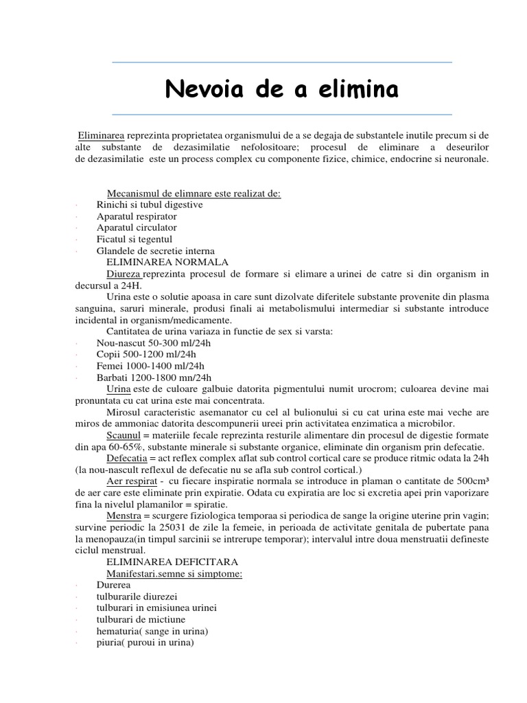 Nevoia de a elimina. Nevoia de a elimina. Eliminarea reprezintă necesitatea organismului de a se debarasa de substanțele nefolositoare vătămatoare rezultate din metabolism. Micţiune emisiune de urină act fiziologic conştient de eliminare. Procesul de eliminare a deseurilor de dezasimilatie este un process complex cu componente fizice chimice endocrine si neuronale.