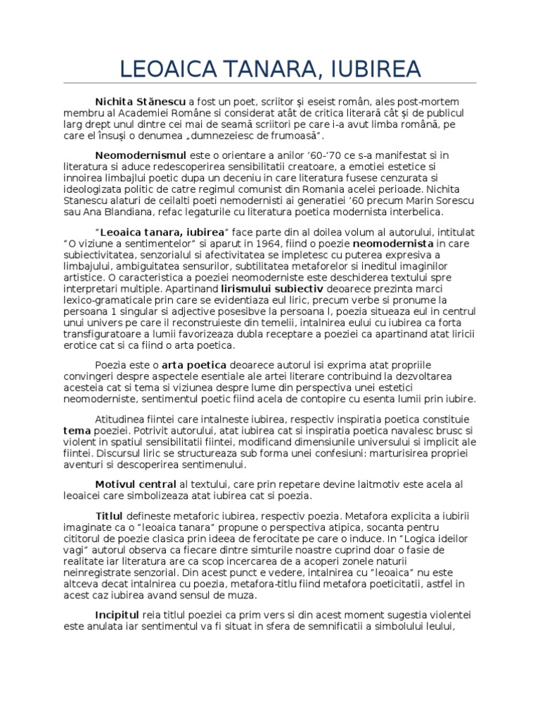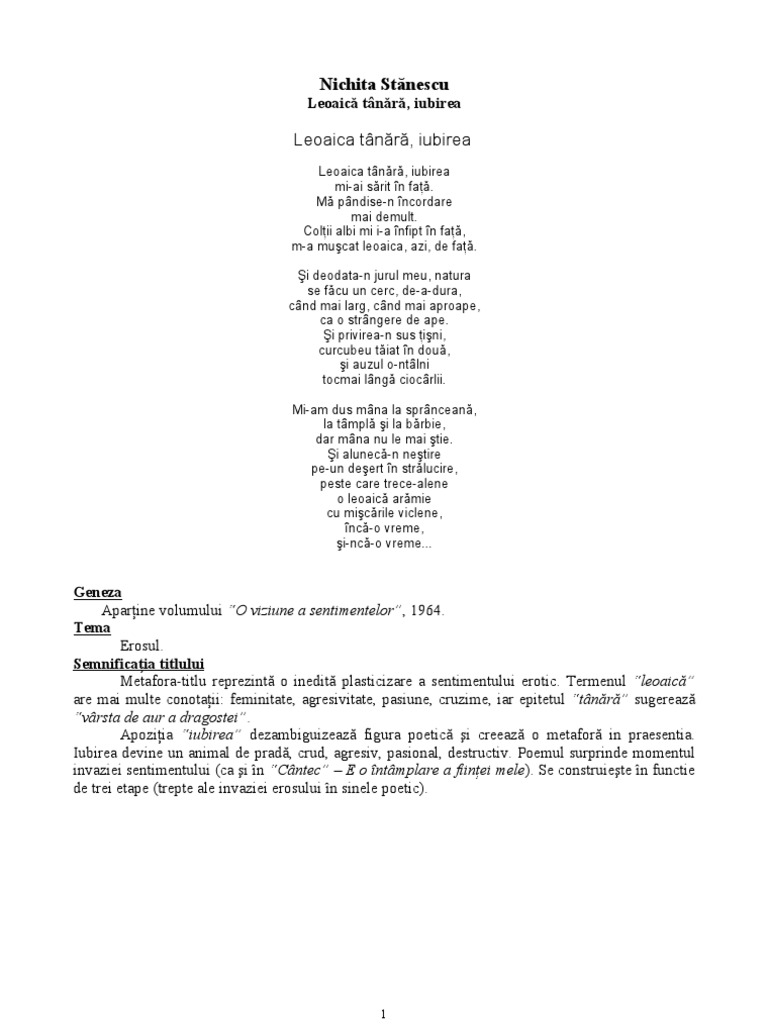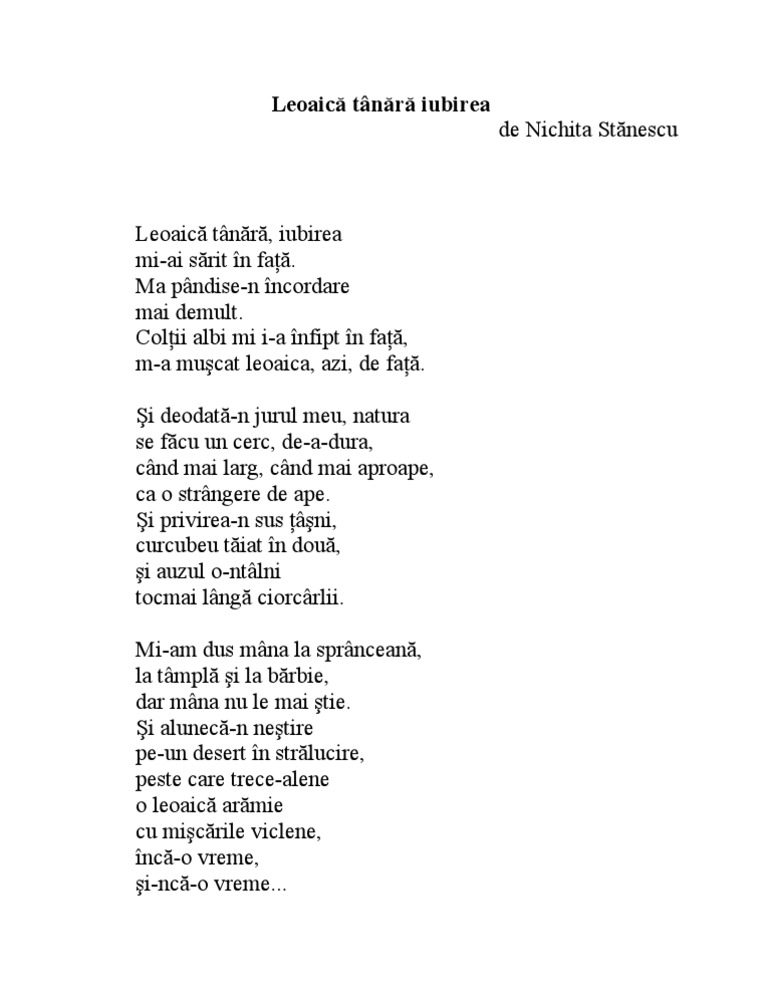 Leoaica tanara iubirea nichita stanescu. In cadrul liricii romanesti reprezinta un inovator al limabjului poetic asezandu se in galeria poetilor mihai eminescu si tudor arghezi. Colţii albi mi i a înfipt în faţă m a muşcat leoaica azi de faţă. Este considerată o capodoperă a liricii erotice româneşti individualizându se prin transparenţa imaginilor şi.